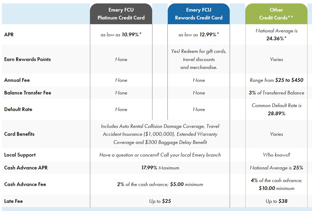 | Emery FCU Platinum Credit Card | Emery FCU Rewards Credit Card | Other Credit Cards** | ||||